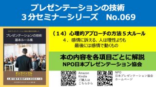 (14)心理的アプローチ5大ルール 今日はその4つめ、感情に訴える 人は理屈・理性よりも最後には情で動くものであるこれまで、聴衆とプレゼンターの間で良い関係をつくること、信頼関係をつくることが大切です。それも、できるだけ […]